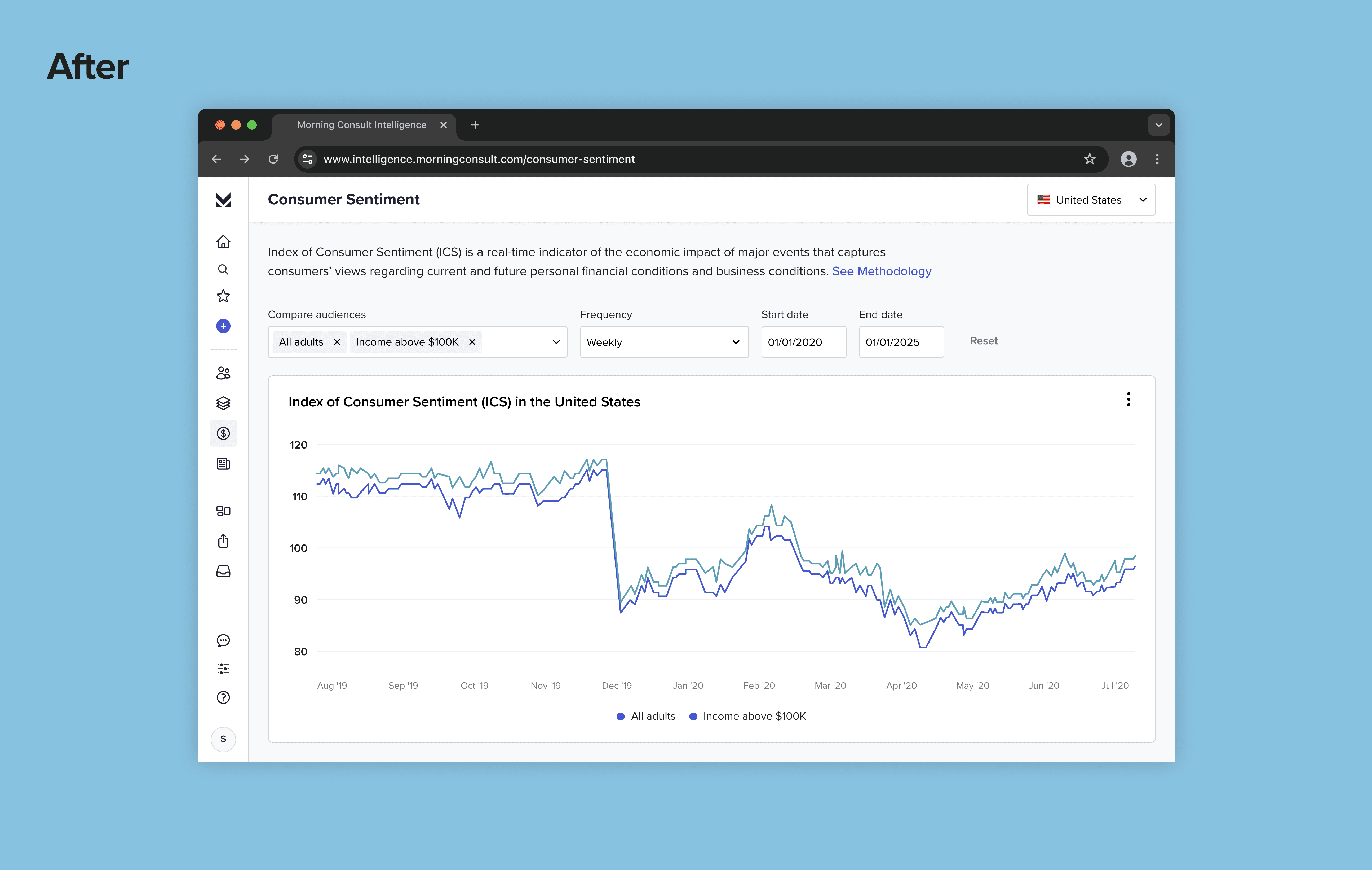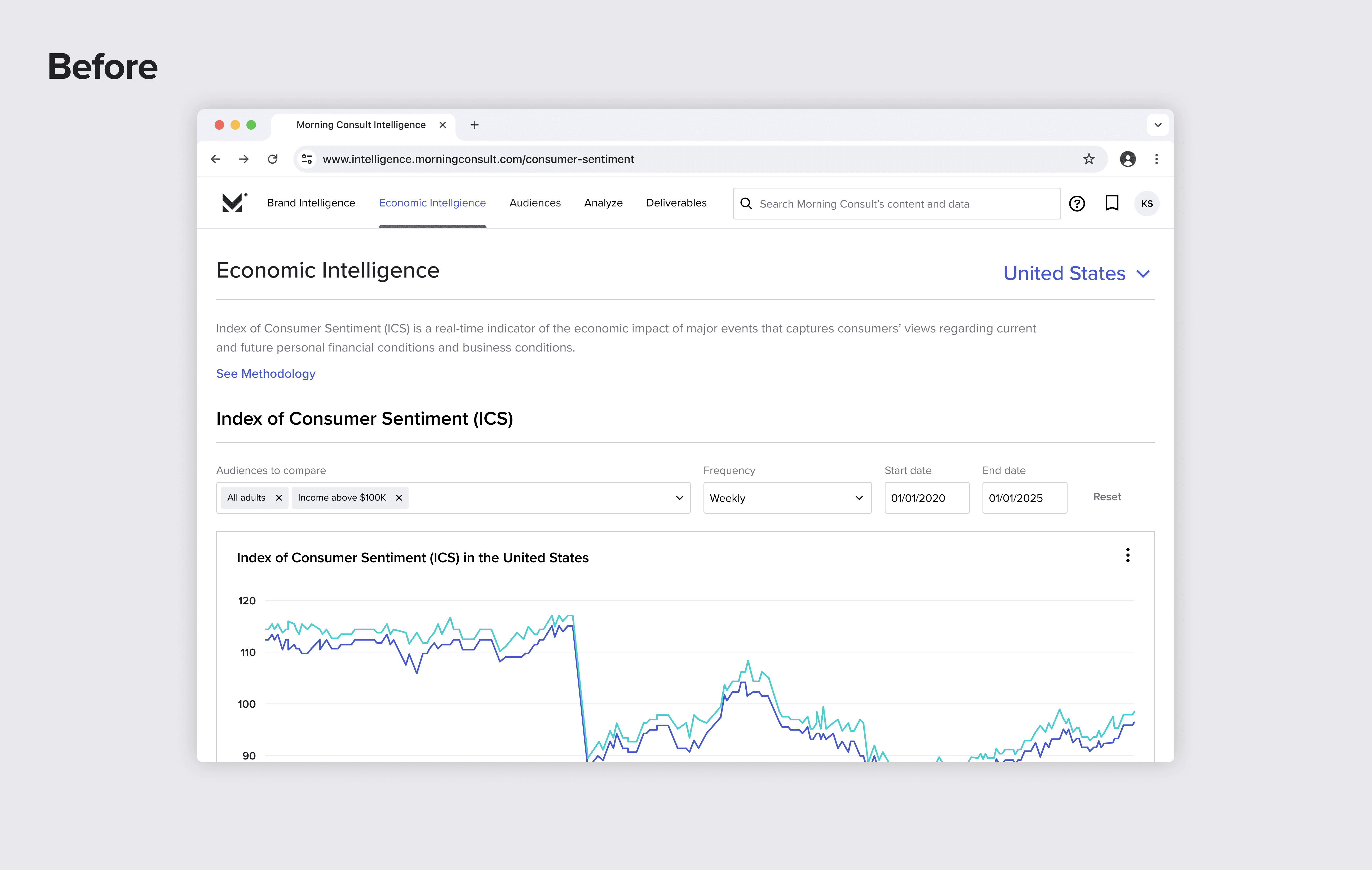 Morning Consult had historically sold each product in it’s SaaS platform as a standalone subscription. After launching a third core product, this standalone subscription model started creating friction. Prospects struggled to understand the offering, existing clients had to justify multiple add-on purchases, and sales teams had difficulty explaining it all. Leadership saw an opportunity to restructure the pricing and packaging to bring in smaller brands who couldn't afford the current pricing model and retain budget-conscious clients at risk of churning. But this wasn't just a commercial decision. The platform's architecture and permissioning were built around the old subscription model, we couldn't simply flip a switch. Our product team was tasked with completely transforming the site structure and navigation to support the new approach, delivering it on time for a go-to-market deadline while multiple teams worked in parallel.